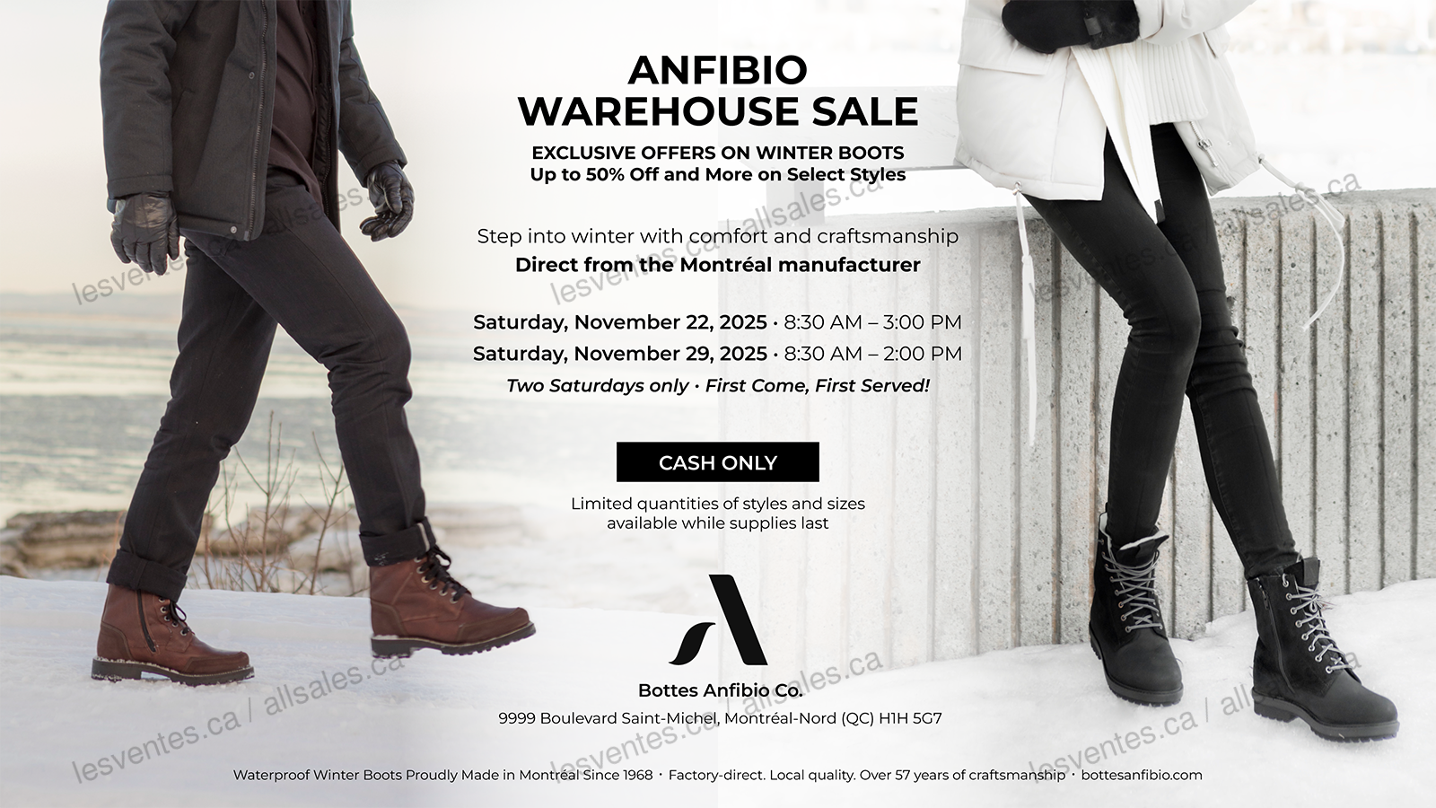Direct from the manufacturer, Anfibio Boots invites you to its warehouse sale of men's and women's winter boots. Two days only, November 22nd and 29th, 2025. Up to 50% off a wide selection!