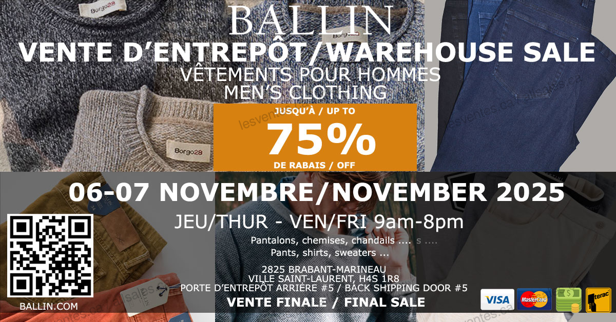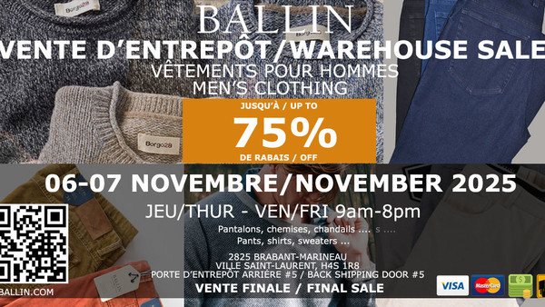 The Ballin Warehouse Sale will take place on November 6-7, 2025. Save up to 75% on the finest men's clothing brands. Pants, shirts, sweaters and much more.