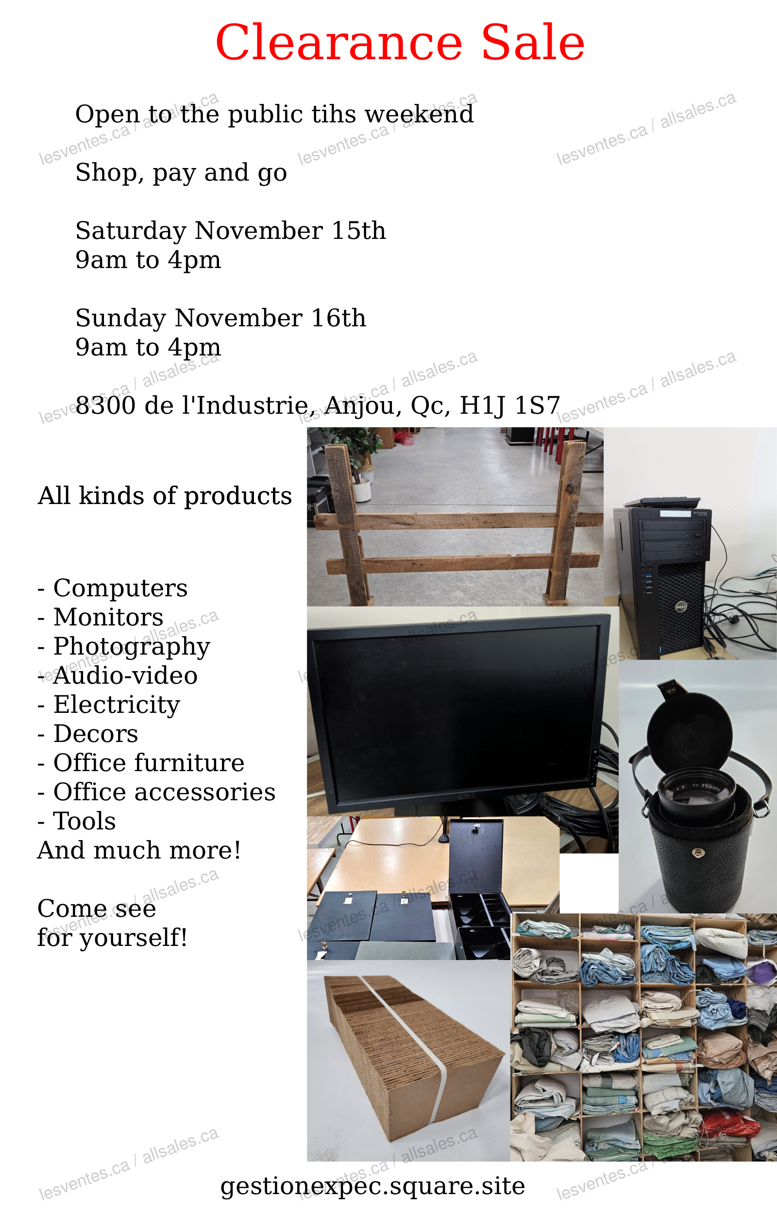 Computers, monitors, office furniture and accessories, photography, decors, electrical, tools, audio and more. EVERYTHING must go!!