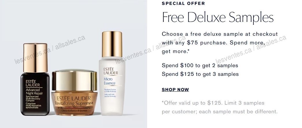 Free Deluxe Samples! Choose a free deluxe sample at checkout with any $75 purchase. Spend more, get more.* Spend $100 to get 2 samples Spend $125 to get 3 samples