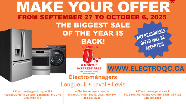 For a limited time until October 6, visit one of our three locations, find the appliance of your dreams, and make an offer the boss won’t be able to refuse!* 0% FINANCING FOR 6 MONTHS WITHOUT INTEREST*