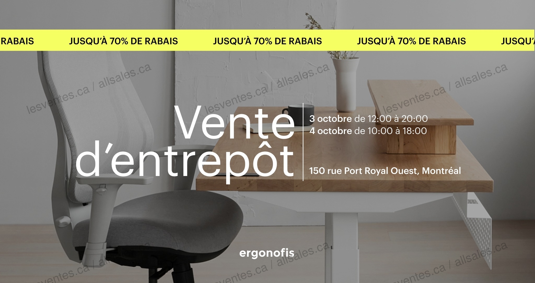 Ergonofis Warehouse Sale in Montreal on October 3rd and 4th. Save up to 70% on adjustable desks, ergonomic chairs, and office accessories ⚡️