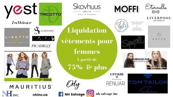 Women's clothing liquidation sale at NH Inc.! Shop women's designer clothing starting at 75% off! Prestigious brands such as In Wear, Cream, Tricotto, Tom Taylor, Eternelle, Kaffe, Orly, Renuar, Lisette L, Moffi, Liverpool & many other brands.