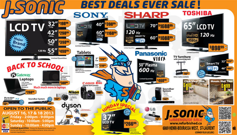 Don't miss J.Sonic best deals ever sale from August 16 to 18, 2013! TV’s, home theaters, tablets, coffee machines, cameras, vacuum cleaners, etc. Quality products, surplus & refurbished televisions, electronics and more at discounted prices!