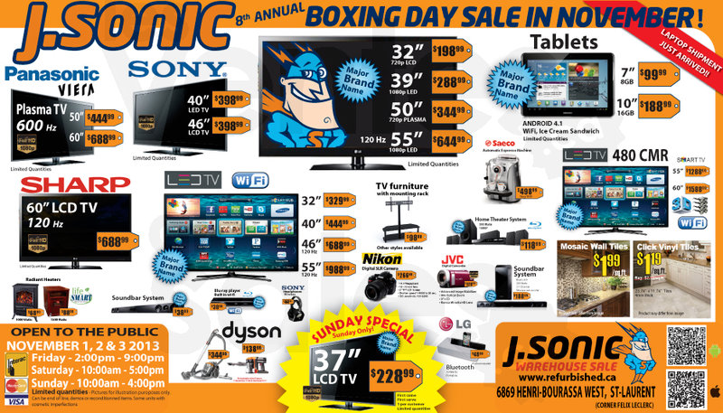 November 1st to 3rd, it's J.Sonic 8th annual Boxing Day sale in November! Save on plasma, DEL and ACL TV's, home theaters, laptops, tablets, digital cameras, coffee machines, vacuum cleaners and much more!