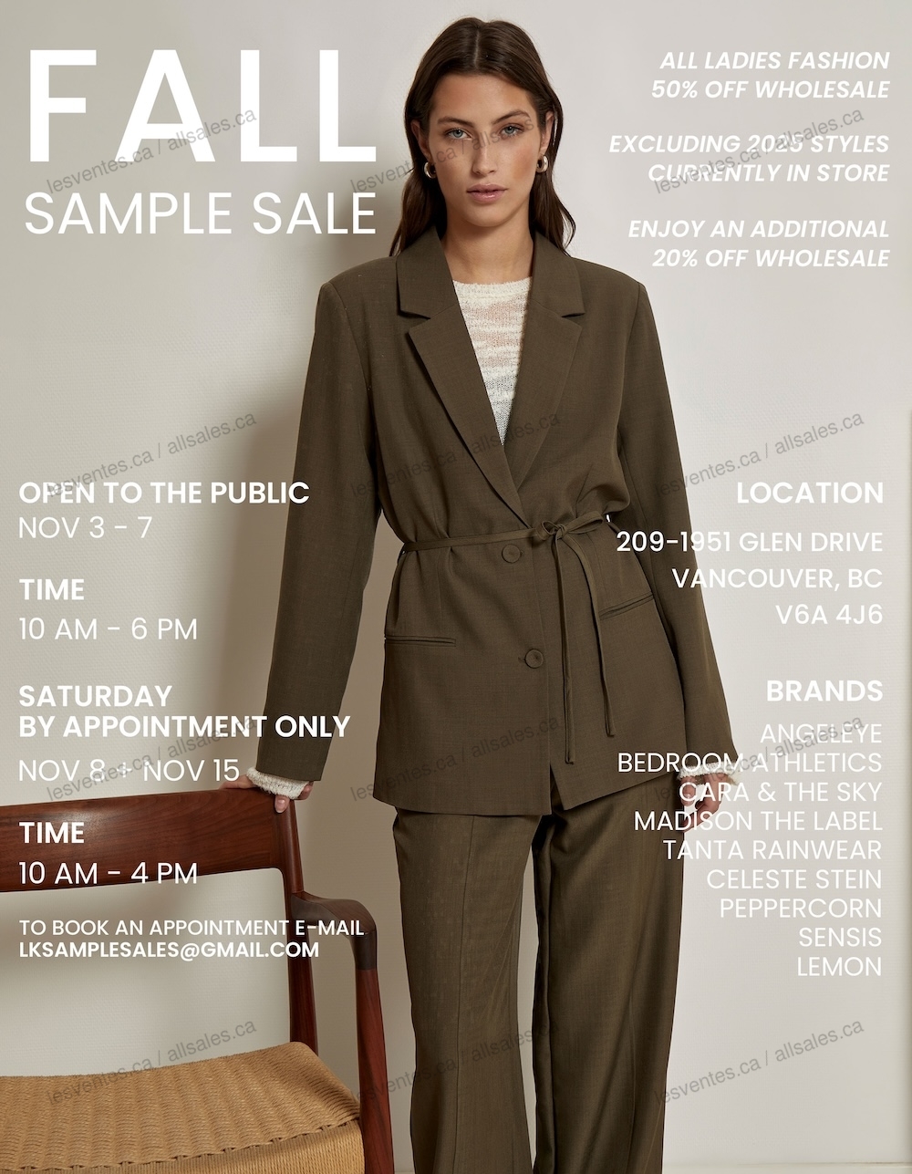 LK Collections Sale in Vancouver from November 3rd to 7th. Up to 50% off women's clothing. Items $2, $5, and $10. Brands: Angeleye, Bedroom Athletics, Oara & The Sky, Madison The Label, Tanta Rainwear, Celeste Stein, Peppercorn+