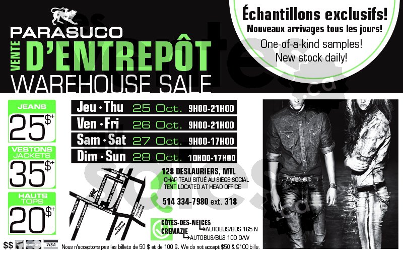 Parasuco's big warehouse sale is back and will be held next October 25 to 28! One-of-a-kind samples and new stock daily. Jeans at $25 and up, jackets at $35 and up, tops at $20 and up.