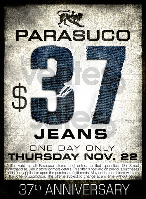 Parasuco is celebrating their 37th anniversary! To mark the occasion, this Thursday November 22 only, jeans for men and women are at $37*. The offer is valid at all Parasuco stores and online. A great gift that we will make sure to take advantage of!