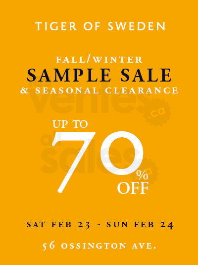 Fall/Winter Sample Sale at Tiger of Sweden in Toronto on February 23rd and 24th! Save up to 70% off clothing, accessories and shoes for men and women!