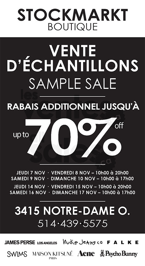 50% - 70% off men’s and women’s James Perse, Nudie Jeans, ACNE, Maison Kitsune and more designer brands for two weekends only, November 7 to 17, exclusively at the STOCKMARKT Boutique sample sale located at 3415 Notre-Dame O. (Near Atwater).