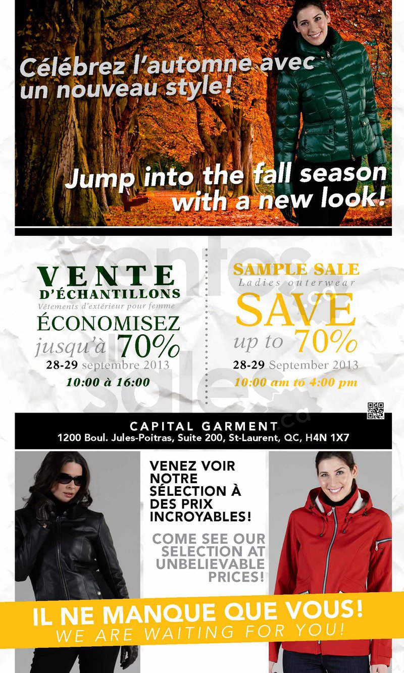 Jump into the fall season with a new look! The Nuage fall sample sale, by Capital Garment, will be held on September 28 and 29. Come and find your new fall outerwear at incredible prices and save up to 70%! We are waiting for you!