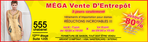 Imported women's clothing sold at incredible prices! 3 days only, June 6, 7 and 8. Save up to 80% on ladies wear well-known brands. End of season, everything must go.