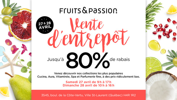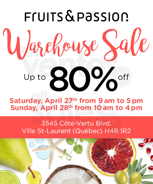 Fruits & Passion Warehouse Sale on April 27th and 28th! Save up to 80% off! Come and discover our collections at our lowest prices ever such as Cucina, Spa, Vitality and Fine Fragrance.