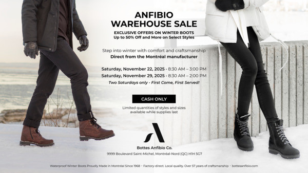 Direct from the manufacturer, Anfibio Boots invites you to its warehouse sale of men's and women's winter boots. Two days only, November 22nd and 29th, 2025. Up to 50% off a wide selection! More