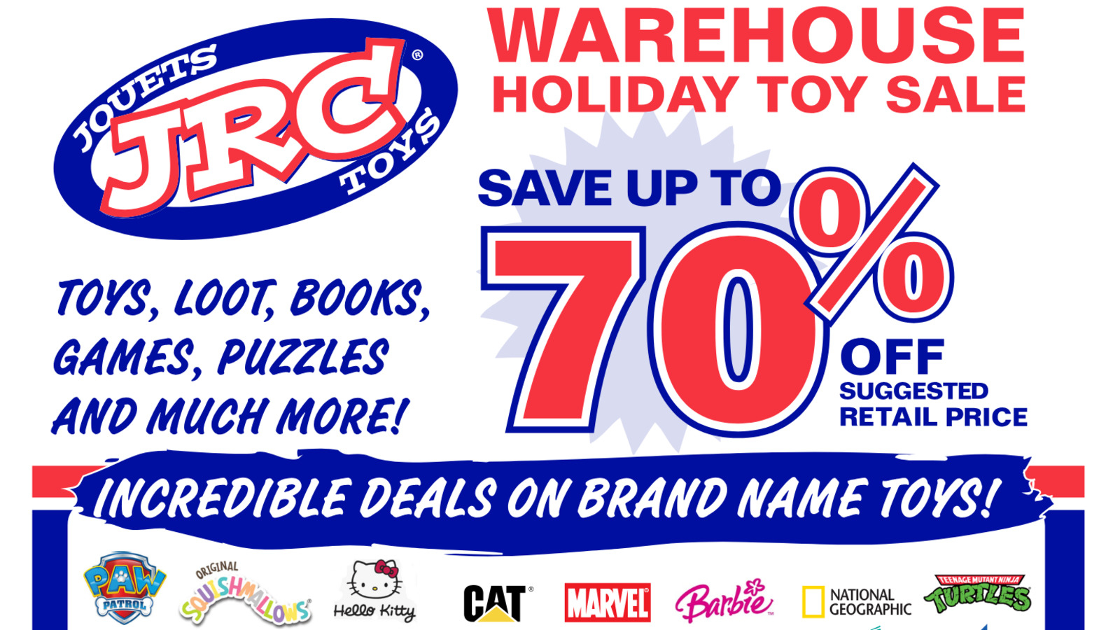 Shop your Holiday gifts at JRC TOYS warehouse toy sale - October 8th to December 24th, 2025! Save up to 70% on brand name toys, books, games, puzzles & more. Paw Patrol, Hello Kitty, Marvel, CAT, Nerf, Pokémon, Playmobil, Mattel and more! More