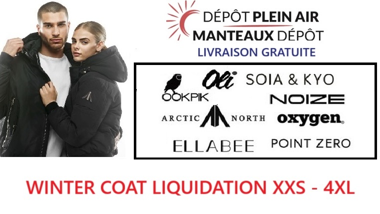 Up to 60% off all coats! More than 15 brands & 75 styles in Sizes XXS to 4XL for Women and Men : Soia & Kyo, Arctic North, Ookpik ,Columbia, BigChill, Point Zero, CanaV, Oxygen, Diamond Trail, Noize, Liquid, Ellabee, Oli, Cruze, Misty... More
