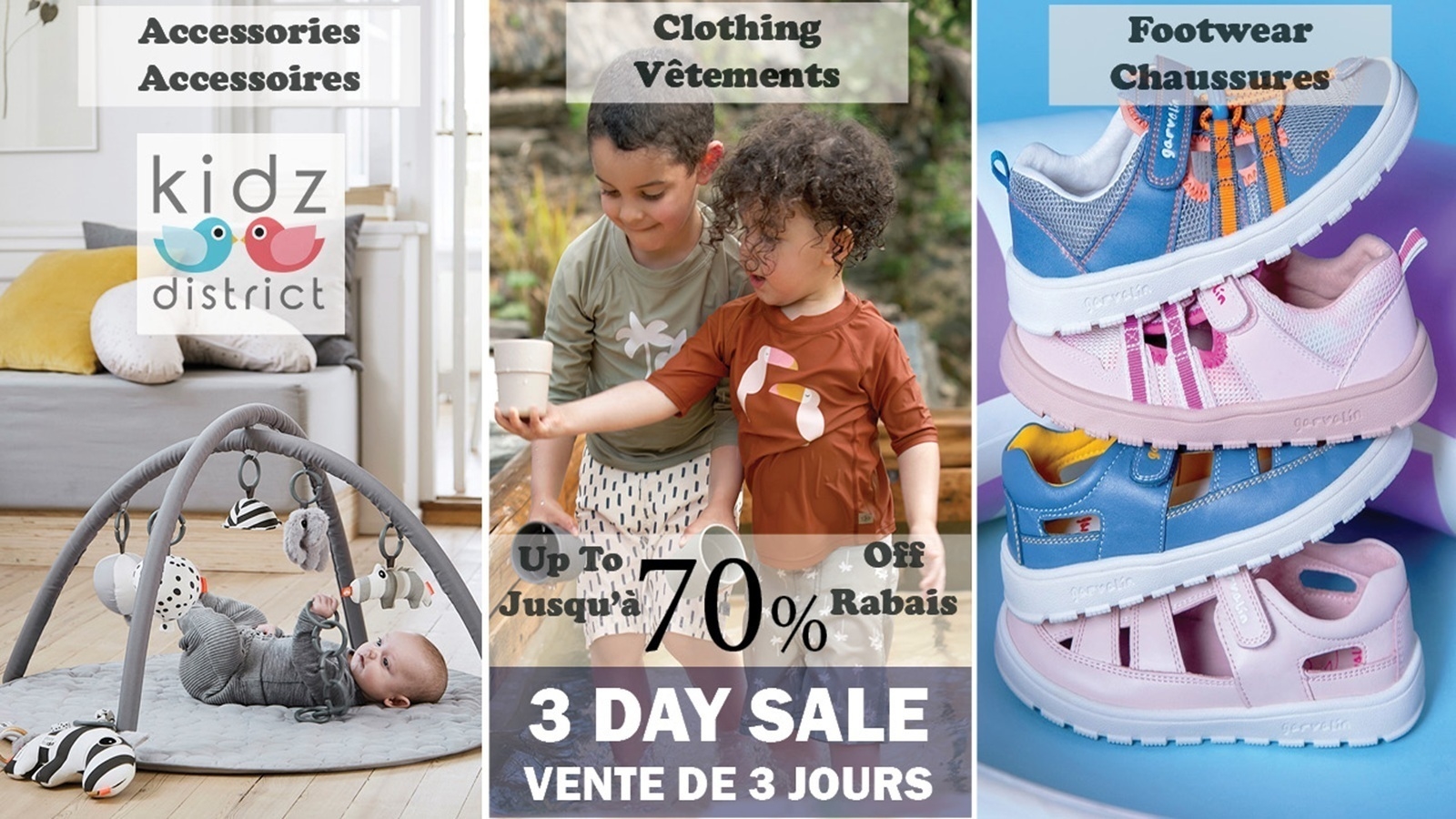 Don't miss the Kidz District warehouse sample sale - 3 day event – April 29-30 & May 1st, 2026. Save up to 70% off clothing, shoes and accessories for ages 0 months to 12 years. More
