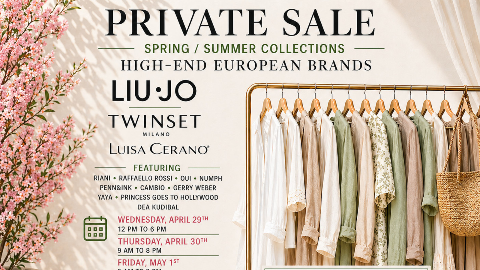 Warehouse & sample sale of European women’s fashion, April 30 to May 8, 2026. Enjoy 70% off and more starting on luxury European brands. Dresses – Shirts – Sweaters – T-shirts – Trousers–Coats – Jackets. More