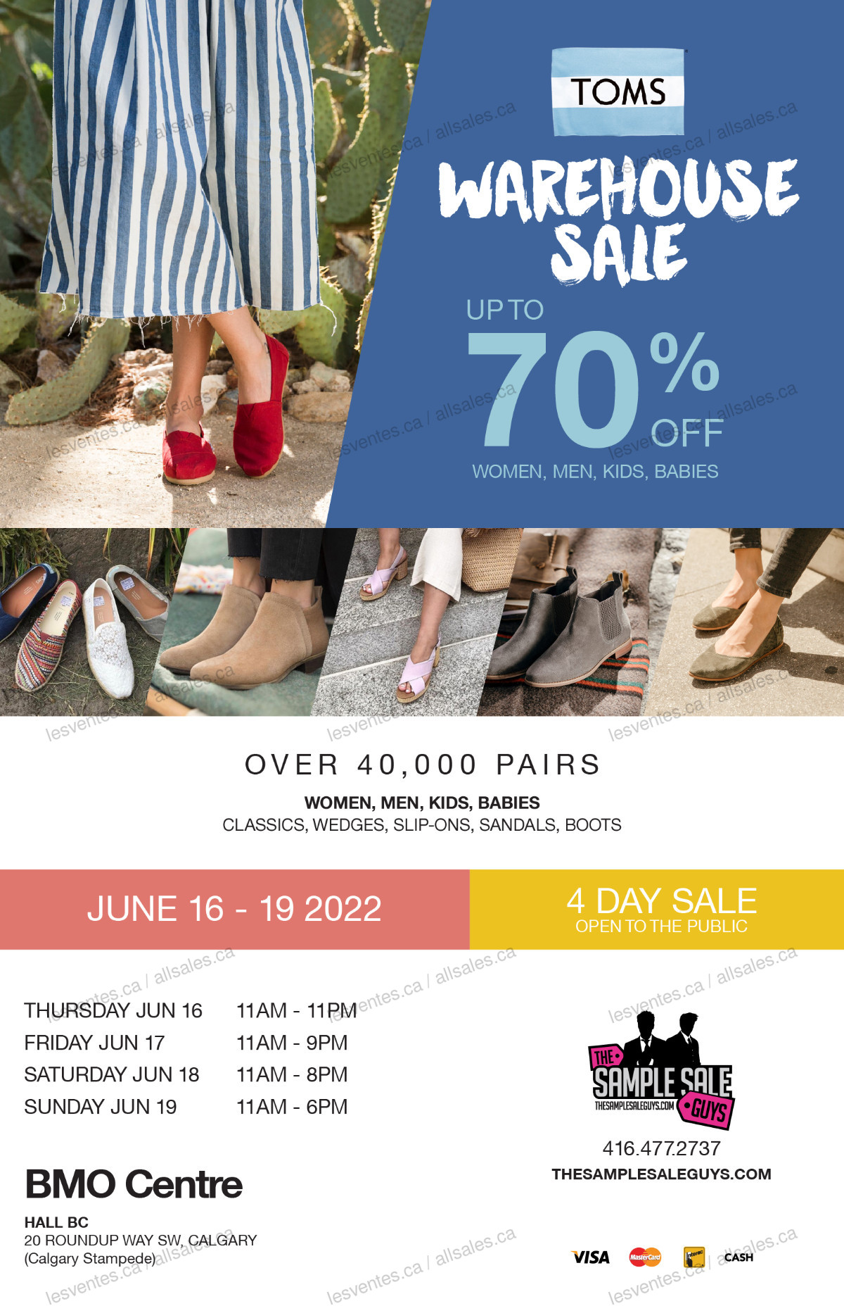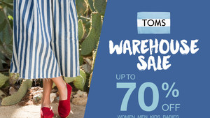 TOMS is having their Warehouse Sale in Calgary, June 16 to 19, 2022. It is going to be the Biggest Shoe Warehouse Sale Ever! Over 40,000 pairs of TOMS at up to 70% off. Women, men, kids, babies. Classics, wedges, slip-ons, sandals and boots.