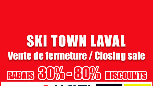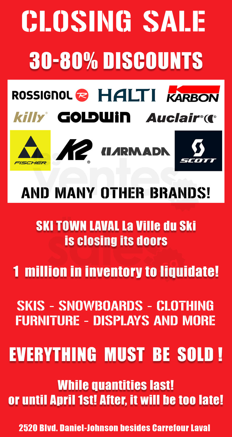 SKI TOWN LAVAL La Ville du Ski closing sale. While quantities last! Save 30-80% off Rossignol, Halti, Karbon, Killy, Goldwin, Fischer, k2, Auclair, Scott, Armada & other brands. 1 million of inventory to liquidate! Skis, snowboards, clothing & more!