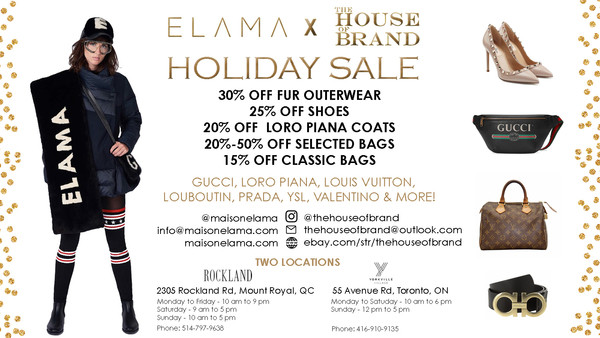 Elama & The House of Brand Designer Holiday Sale! Save 30% off fur outerwear and 20% off Loro Piana coats, 25% on shoes and 20-50% off on selected bags! Shop luxury brands such as Gucci, YSL, Christian Louboutin, Louis Vuitton, Valentino...