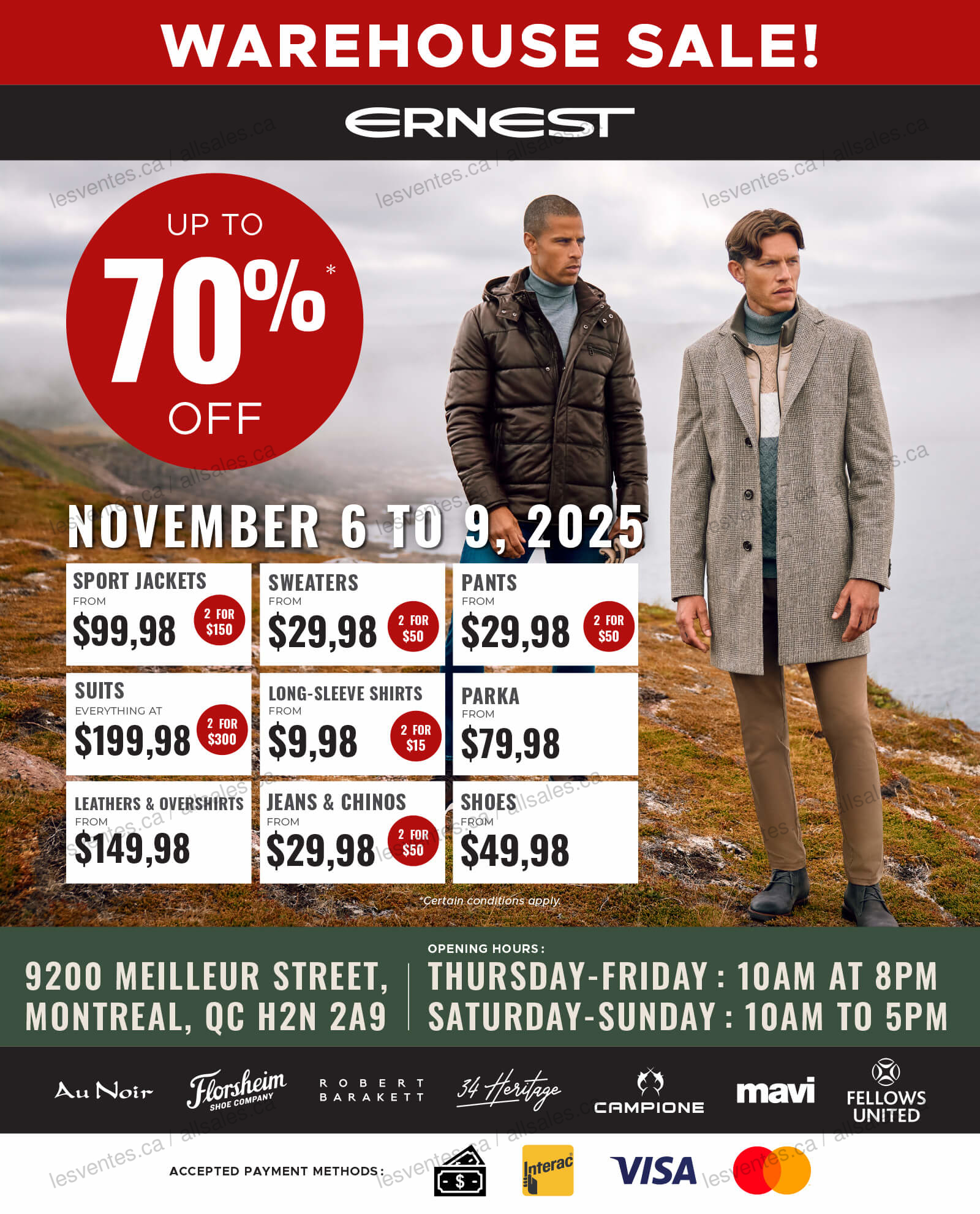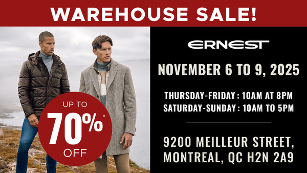 The Ernest Warehouse Sale is back, from November 6 to 9, 2025. Enjoy up to 70% Off a curated selection of Sweaters, Shirts, Corduroy styles, Suits, Sport Jackets, Jeans, Chinos, and more.