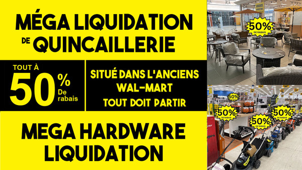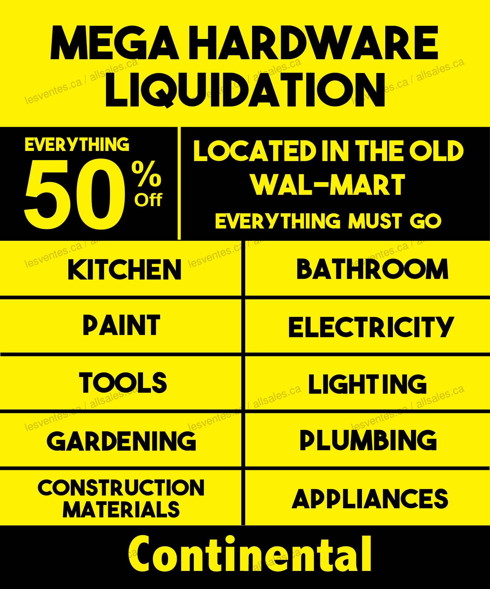 Mega hardware liquidation. Several items are reduced at incredible prices! 50% off on everything: kitchen, bathroom, paint, tools, lighting, gardening, plumbing, appliances and much more! Come see us!