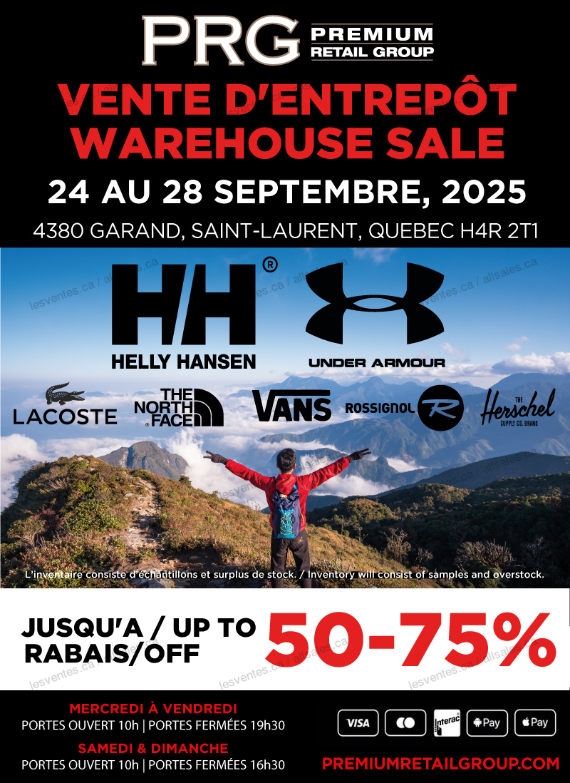 Premium Retail Group Sample Sale from September 24 to 28, 2025 in Montreal. Save up to 75% on Helly Hansen, Under Armour, Lacoste, Vans, Rossignol, Herschel, and more. Men's, women's, and children's clothing!