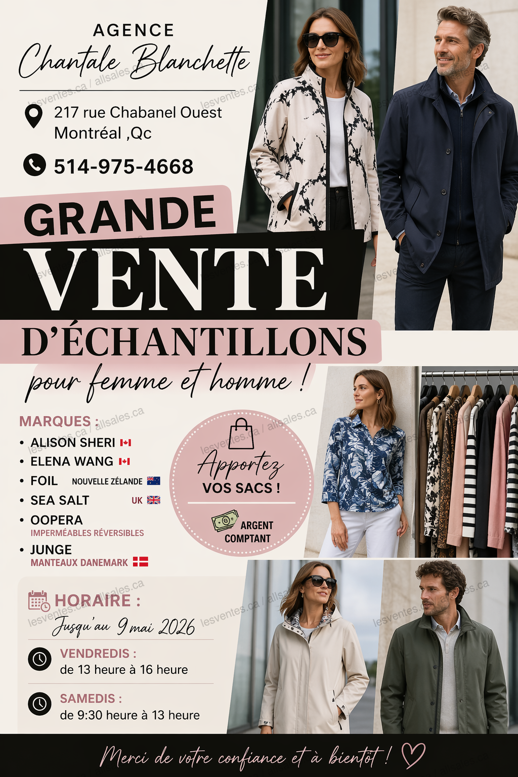 Huge sample sale with discounts of up to 80% off the retail price. Women's & men's fashion. Wide range of sizes. Junge (coats, Denmark), Alison Sheri (Canada), Elena Wang (Canada), Sea Salt (UK), Oopera reversible raincoats. Until May 9, 2026.