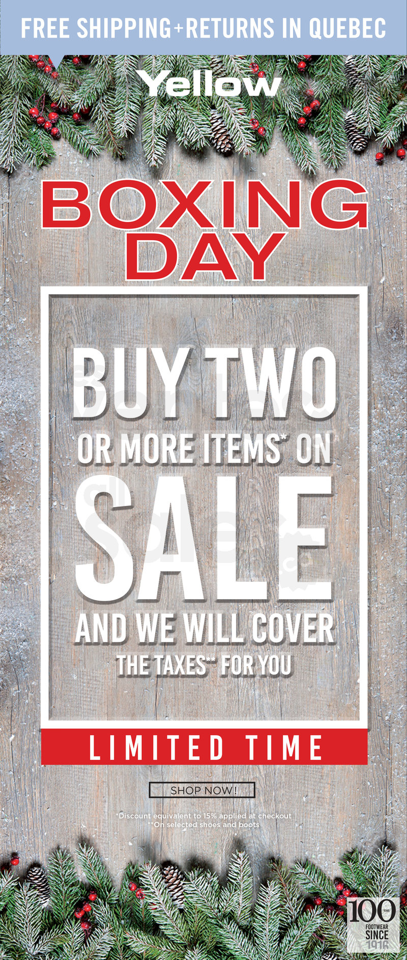 Don't miss the Boxing Day sale event at all YELLOW stores and online! From December 26th to January 5th, buy two or more items* on sale, and we will cover the taxes** for you!