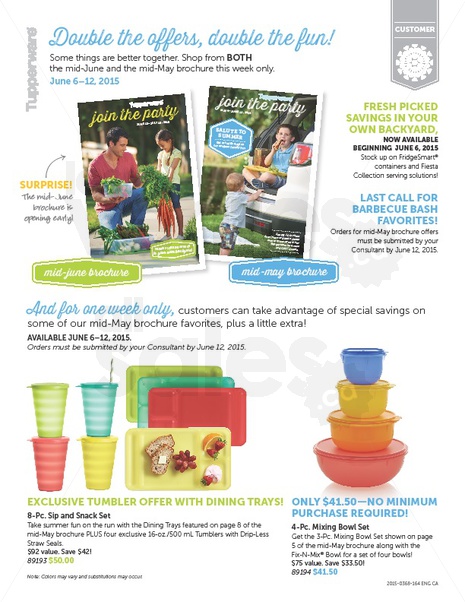 The most spectacular Tupperware brochure of the year! Buy one FridgeSmart 4 pce set and get one free! Save $103.50. Also, the 17 pce Fiesta Serving Collection is $66 ($136 value). Do not miss many more great savings in our mid-June brochure.