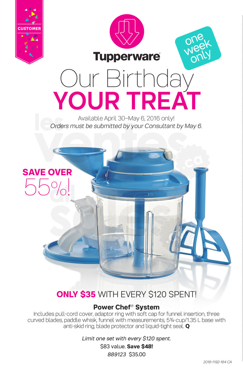 Tupperware's Birthday, your treat! Until May 6, The Power Chef System is only $35 (value $83) with every $120 spent! Do not miss all the current promotions for our customers as well as for our hosts and new consultants for great savings!
