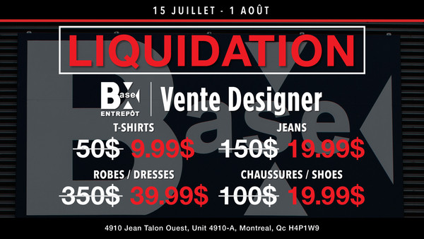 Don't miss the huge Designer Sale by Base X from July 15th to August 1st, 2021 in Montreal. T-shirts at $9.99 (reg. $50), jeans at $19.99 (reg. $150), dresses at $39.99 (reg. $350), shoes at $19.99 (reg. $100)!