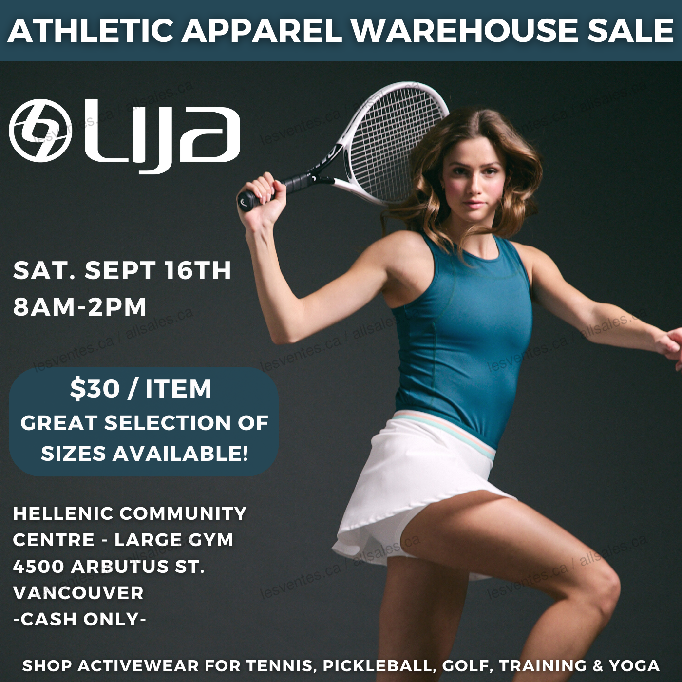 Shop LIJA women’s activewear warehouse sale in Vancouver! Enjoy a great selection at only $30/item. Activewear for tennis, pickleball, golf, training and yoga.