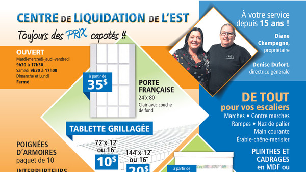Centre de liquidation de l'Est, always incredible prices! French doors, handles, curtains, blinds, everything for stairs, moulding, frames, paint, home decor accessories and much more!