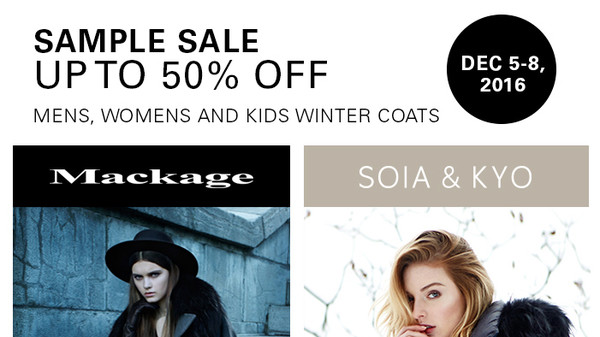 Sample sale December 5th to 8th in Thornhill, Ontario. Up to 50% off Mackage, Soia & Kyo mens, womens and kids winter coats!