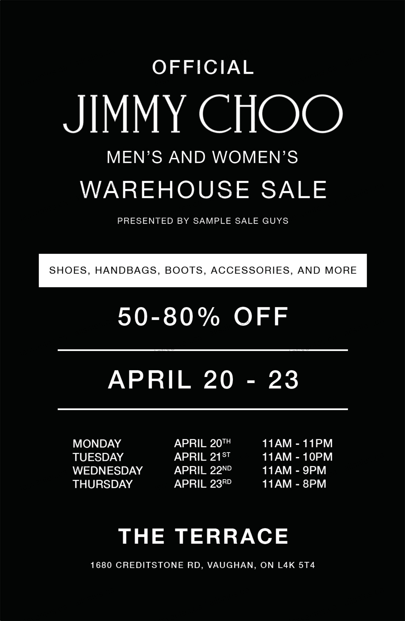 The highly anticipated Jimmy Choo Warehouse Sale is returning to the GTA, offering 50%-80% off on a variety of products, including shoes, boots, handbags, small leather goods, accessories, and more.