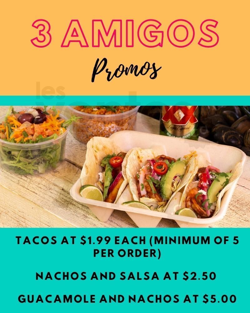 Many 3 Amigos promotions to enjoy at home! Treat yourself with delicious tacos, nachos or guacamole.