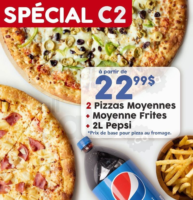 Double Pizza offers you a variety of promotions as many online as in restaurants. Enjoy two medium pizzas with fries and a 2L Pepsi for $22.49 or two large pizzas with fries and a 2L Pepsi for $28.99!
