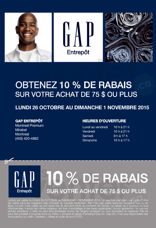 Until November 1st only! Get a 10% discount on all purchases of $75 or more at Gap Mirabel Premium Outlets!