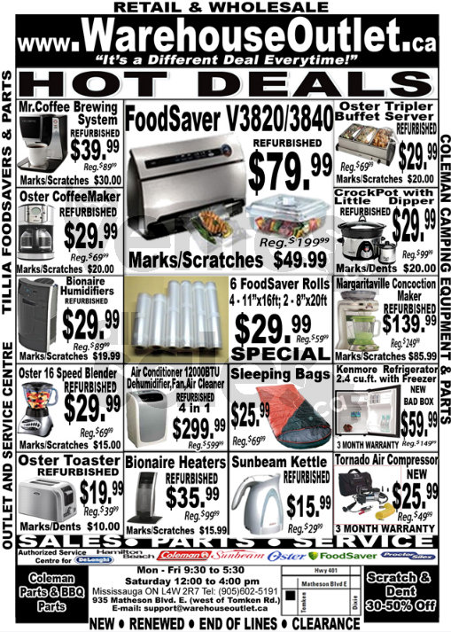 Outlet and Warranty Centre discounts from 30% to 80%. Small kitchen appliances for brand names: Oster, Sunbeam, Bionaire, Holmes, FoodSavers, Seal-a-Meal, Rival, Margaritaville, Mr.Coffee, Hamilton Beach and Proctor Silex.