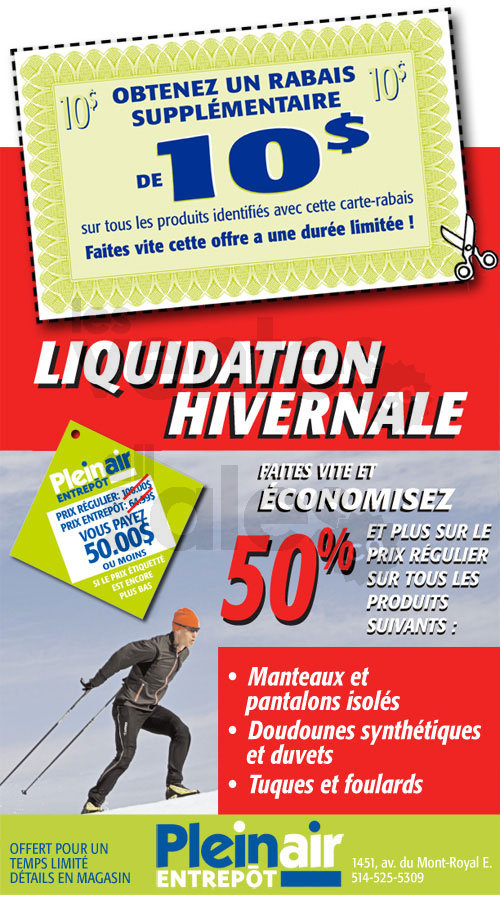Plein Air Entrepôt offers more discounts on winter sports products! Hurry and save 50% off or more on coats, insulated pants, synthetic jackets, duvets, toques and scarves!