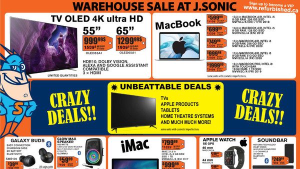 Warehouse sale at J. Sonic, February 18 to 20, 2022! Shop crazy deals on TVs, Apple products, tablets, home theatre systems and much more! Samsung, LG, TCL, Apple, Hisense, VIZIO, ION, SONY, dyson and other brands.