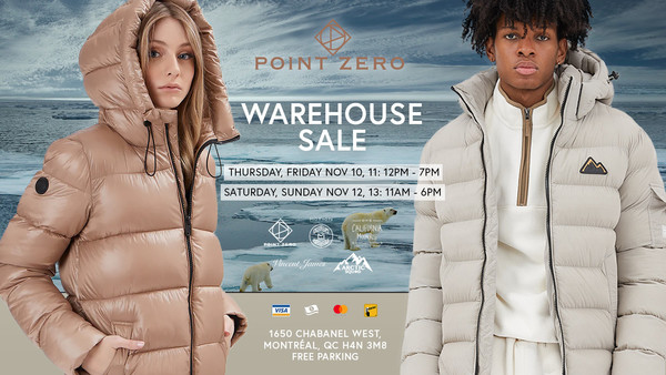 The Point Zero warehouse sale is back in Montreal, November 10 to 13, 2022! Take advantage of discounts of up to 70% on a wide selection of men's and women's clothing!