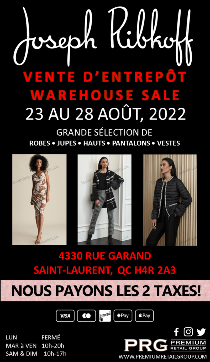 Joseph Ribkoff warehouse sale from August 23 to 28! Great selection of skirts, dresses, top, pants and jackets. We pay both taxes!
