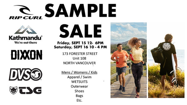 Don't miss the Ripcurl, Dixxon, DVS, TSG & more sample sale in Vancouver. Two days only - September 15 & 16! Huge selection of men's, women's and kid's apparel/swim, wetsuits, outerwear, shoes, bags, etc.