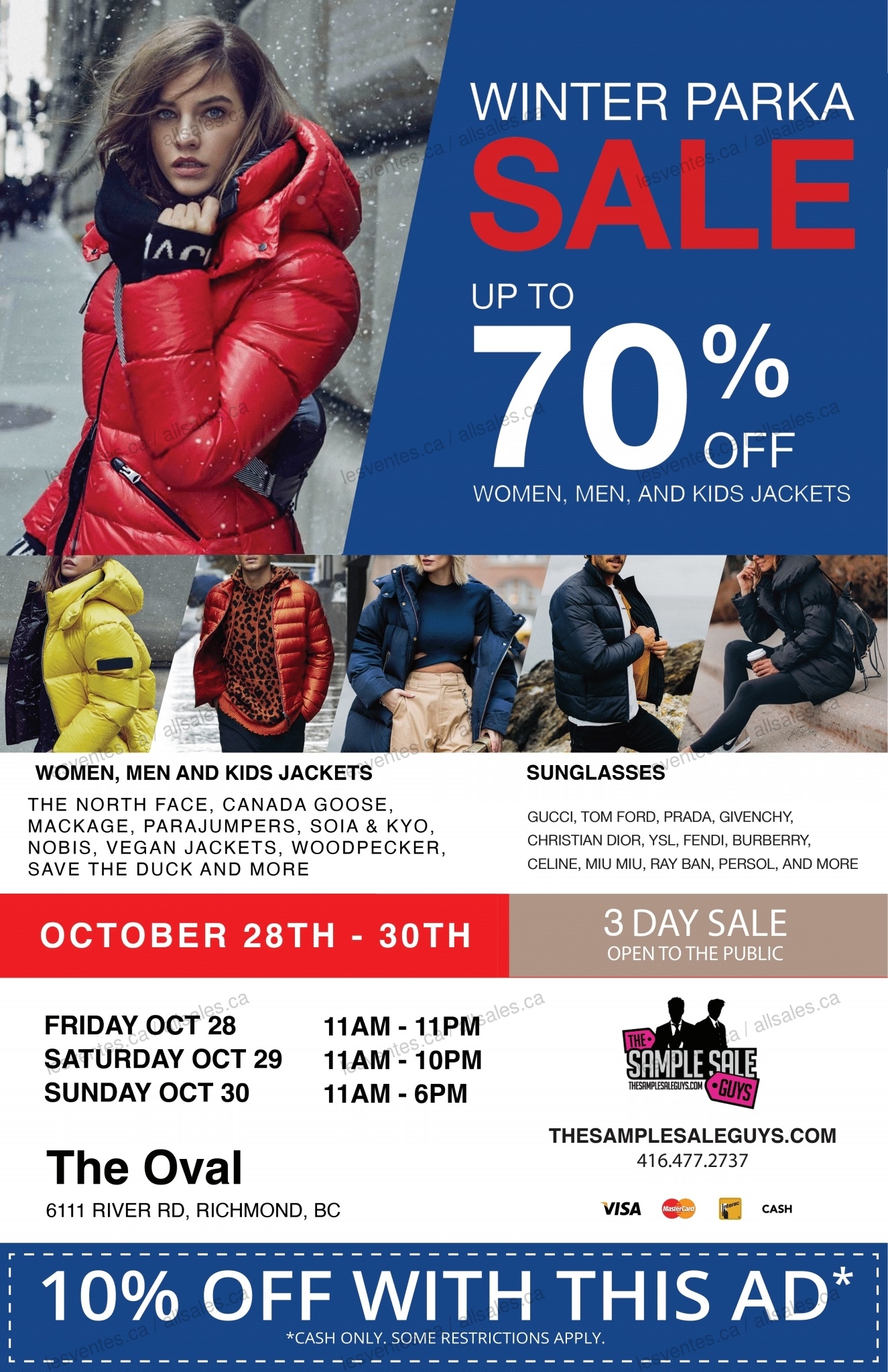 Winter parka sale by Sample Sale Guys October 28-29-30 in Richmond. Up to 70% off coats, jackets & sunglasses for men & women! The North Face, Mackage, Vegan Jackets, Parajumpers, Save The Duck, Soia & Kyo, Nobis, Woodpecker & more.