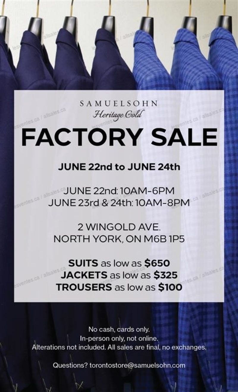 Don't miss the Samuelsohn Factory Sale in Toronto, June 22nd to June 24th, 2025! Suits as low as $650, Jackets as low as $325, Trousers as low as $100.