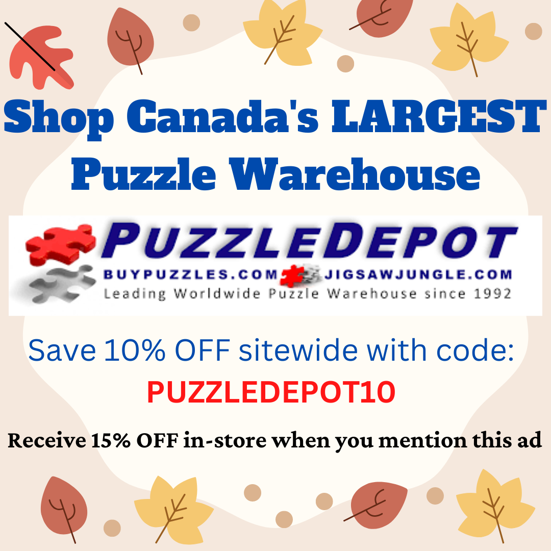 Shop our selection of 100,000 + jigsaw puzzles, games and accessories from the world's top brands piled high on 2 floors! Receive 15% off instore when mentioning this ad! Save 10% on your online purchase by using promo code: PUZZLEDEPOT10 at checkout