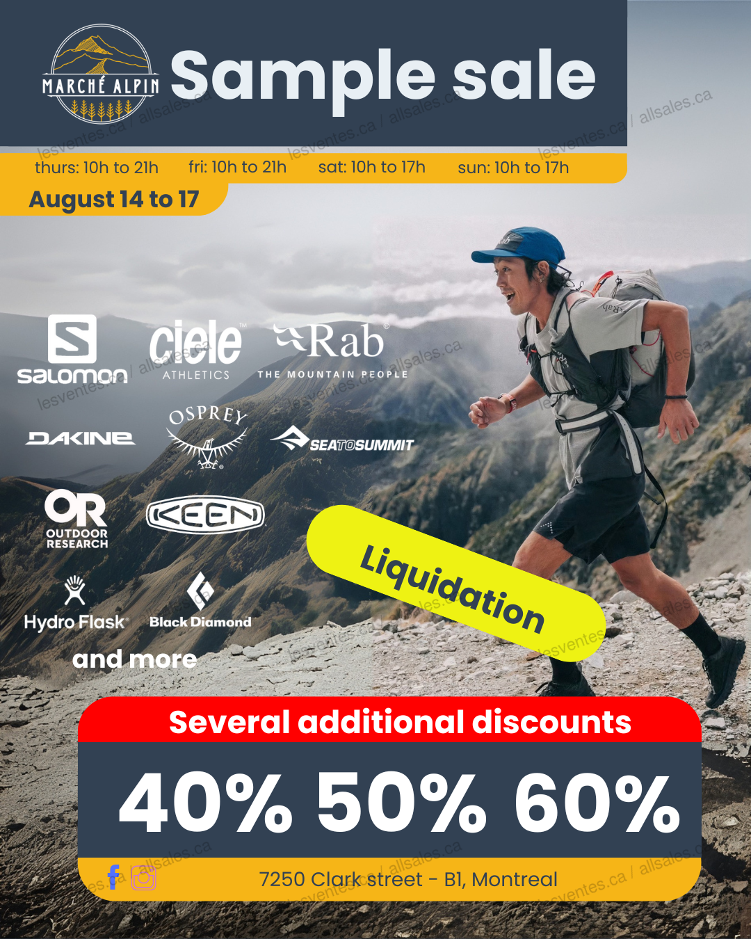 Warehouse sale at Marché Alpin from August 14th to 17th. Enjoy exceptional discounts of 40% to 60% plus additional discounts on thousands of products. A wide selection of clothing and gear to enjoy the summer!